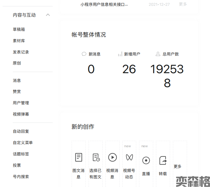 一、注册开通公众号注册公众号之前需要准备的东西:一个邮箱、一个手机号、个人身份证号或者营业执照、绑定身份证的微信1、注册公众号,其实比较简单,首先在网页上搜“微信公众平台”,找到微信公众号官方平台,点进去,会出现登录界面。再点击上方的立即注册。2、注册界面了,需要用邮箱申请,填写好邮箱之后,会有验证码,依次填写密码进入...